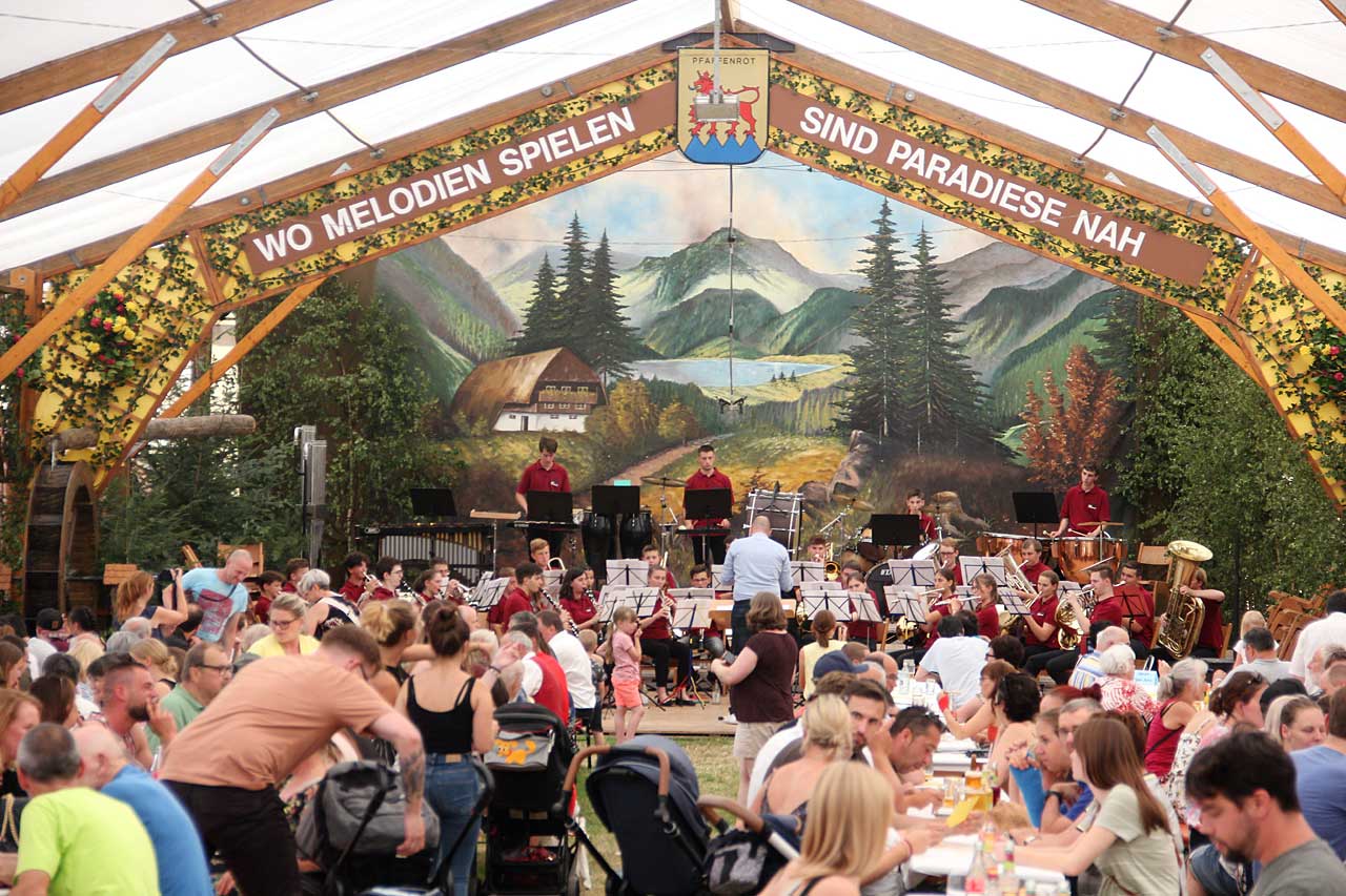 Ein abwechslungsreiches Unterhaltungsprogramm sowie ein reichhaltiges kulinarisches Angebot bei optimalem Festwetter waren am ersten Juliwochenende ein wahrer Publikumsmagnet beim Musikfest in Pfaffenrot. Schon am frühen Samstagabend war das wieder einmal einzigartig geschmückte vereinseigene Festzelt bis auf den letzten Platz gefüllt, was sich auch an den folgenden Tagen nicht ändern sollte.