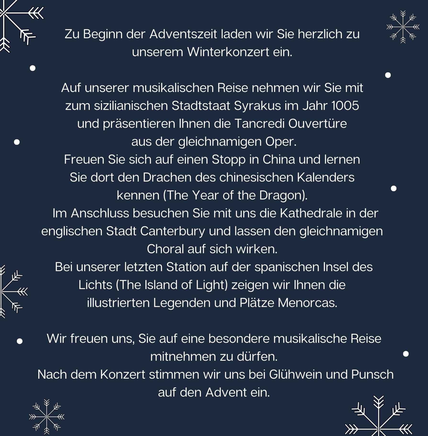 Begonnen hat die Reise im sizilianischen Stadtstaat Syrakus. Mit der Tancredi Ouvertüre (arr. Franco Cesarini) präsentierte der Musikverein ein bekanntes Werk aus der gleichnamigen Oper von Gioacchino Rossini. Fortgesetzt wurde die Reise auf dem asiatischen Kontinent. Die  spirituellen Worte von „Share My Yoke“ (Joy Webb) hat Ivor Bosanko (arr. Brian Bowen) zu einem besonderen Solo-Werk für Kornett und Blasorchester arrangiert. Alexander Wagner am Kornett sorgte mit der bewegenden Melodie beim Publikum für Begeisterung. Mit dem nächsten Werk „The Year Of The Dragon“ (Philip Sparke) konnten die Besucher den Drachen des chinesischen Kalenders kennenlernen. Der erste Satz „Toccata“ begann mit voller Dramatik und Spannung. Im zweiten Satz „Interlude“ folgte ein lyrisches Zwischenspiel. Das Werk endete im einem vituosen „Finale“. Den zweiten Konzertteil eröffneten wir mit Titeln aus dem japanischen Anime-Film „Princess of Mononoke“ (Jo Hisaishi, arr. Takashi Hoshide). Fortgesetzt wurde die musikalische Reise in Europa. Orchester und Publikum machten Halt in der englischen Stadt Canterbury. In der dortigen Kathedrale erklang der gleichnamige Choral (Jan van der Roost) mit Tutti-Passagen, die das Orchester wie eine riesige Orgel klingen ließ. Die letzte Station der musikalischen Reise führte uns auf die spanische Insel des Lichts. Mit dem Werk „The Island of Light“ (José Alberto Pina) zeigte unser Orchester mit Solo-Melodien, massiven Tutti-Passagen und Soundeffekten eindrucksvoll die illustrierten Legenden und Plätze Menorcas. Als Zugaben durften wir den „Florentiner Marsch“ (Julius Fucik) und „Cinderella´s Dance“ (Karel Svoboda) mit der Titelmelodie aus „Drei Haselnüsse für Aschenbrödel“ präsentieren. Zur Einstimmung auf die bevorstehende Weihnachtszeit gab es nach Konzertende eine Winter-Bar mit Glühwein, Punsch, Schokofrüchten und gebrannten Mandeln.